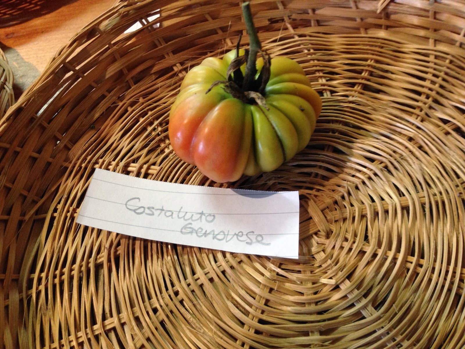 COSTOLUTO GENOVESE (Heirloom, Living Seeds - original cellophane packaging*): Medium to small Italian ribbed tomato. Ripens to a bright orange red. Susceptible to disease, not a strong plant, but absolutely the best tasting tomato that we have ever tried. Very decorative when sliced. Savoury, deep flavour. Definitely wins the prize for most delicious of all. 10% germination.